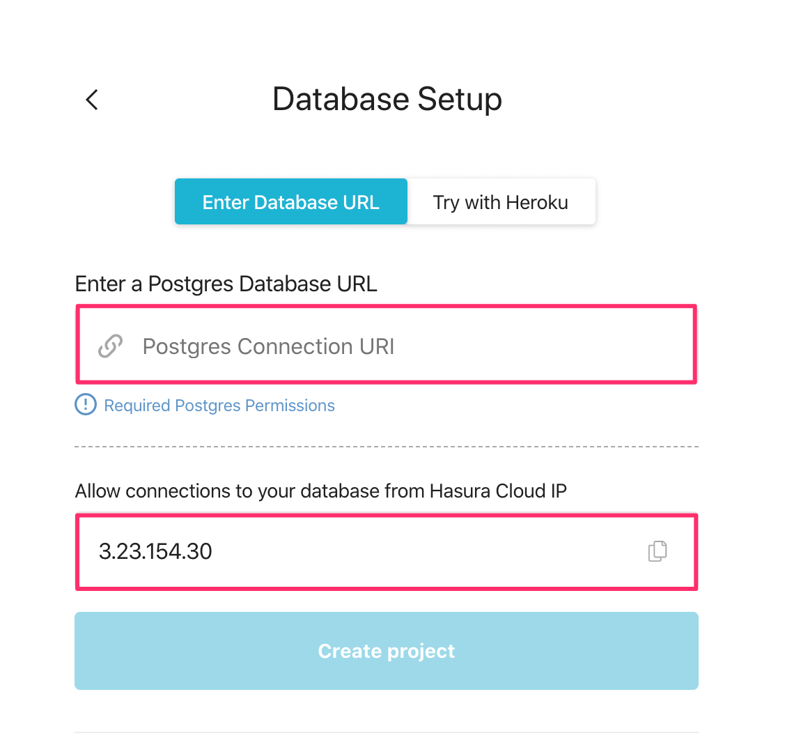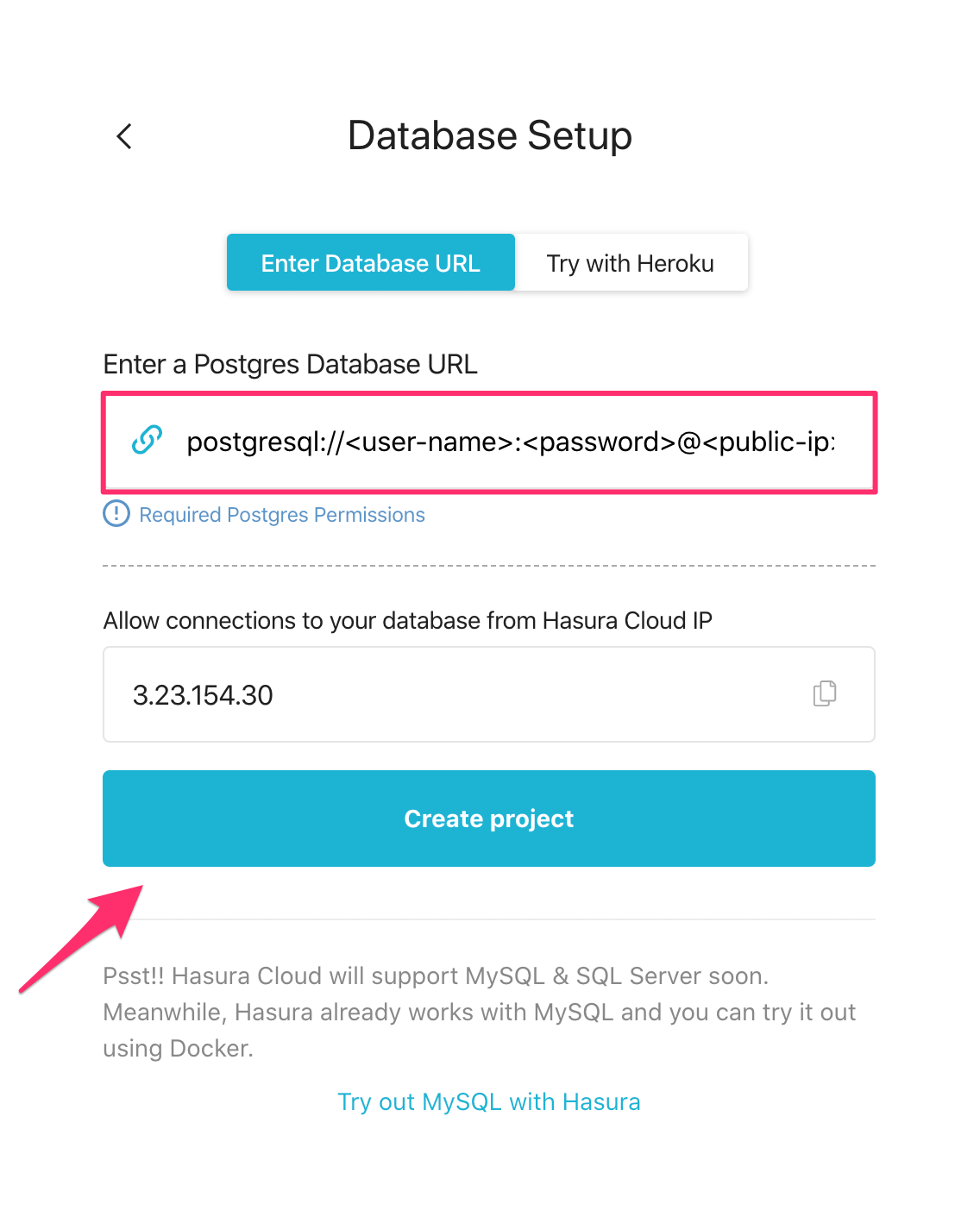 Back on the Hasura Cloud dashboard, enter the database URL that we constructed in step 4: