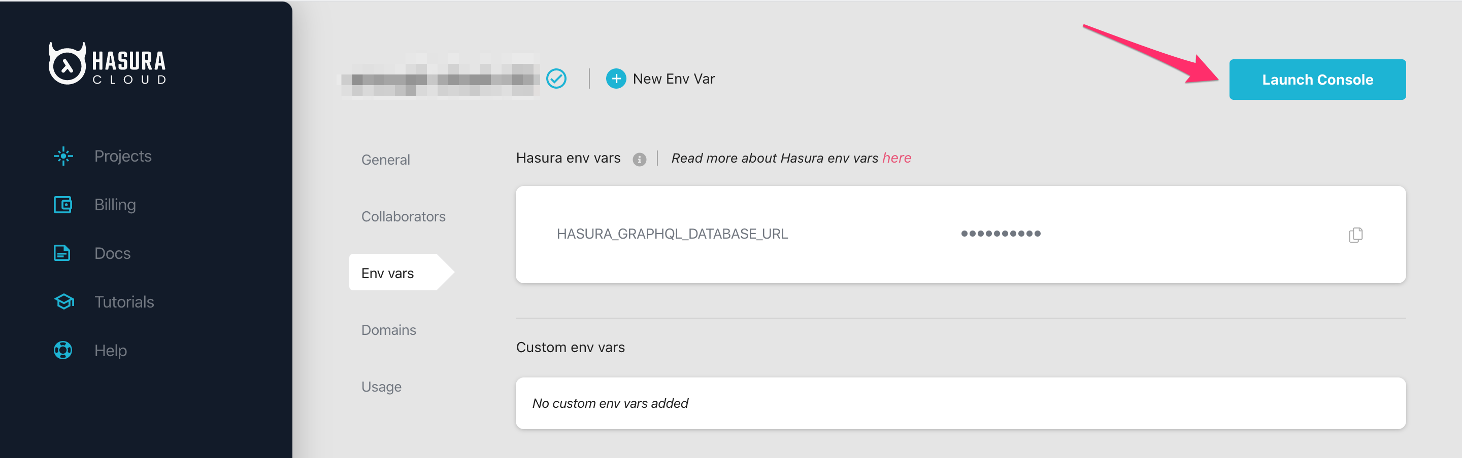You can also click the gear icon to manage your Hasura Cloud project. (e.g. add collaborators, env vars or custom domains) and add an admin secret to make sure that your GraphQL endpoint and the Hasura console are not publicly accessible.