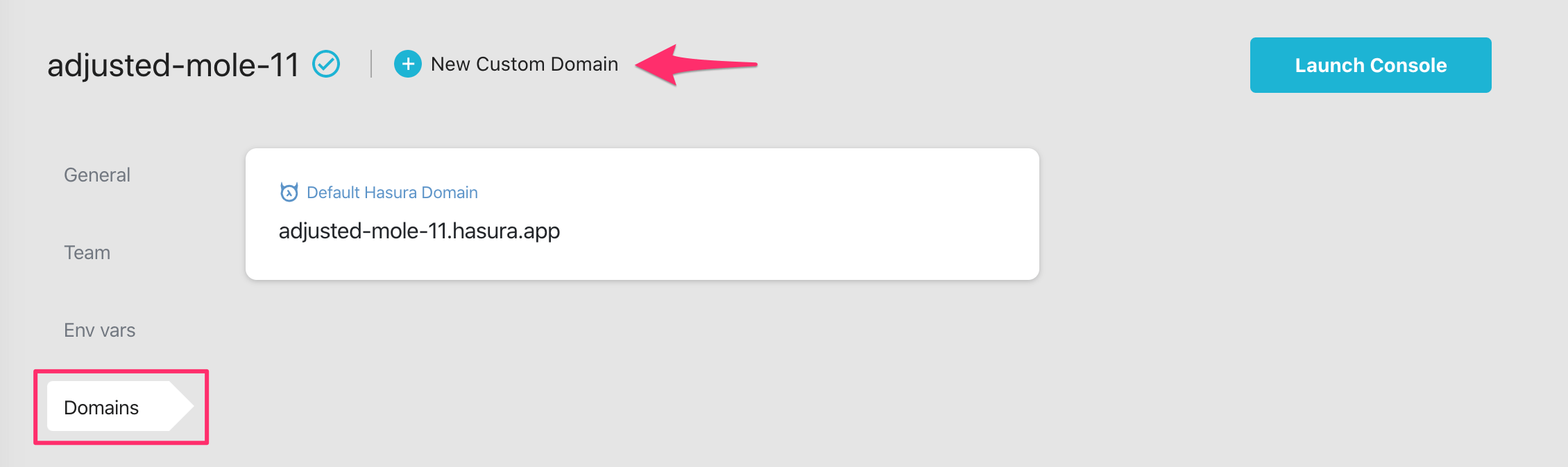 In the Domains tab, you can see the default Hasura domain, and you have the possibility to add custom domains.