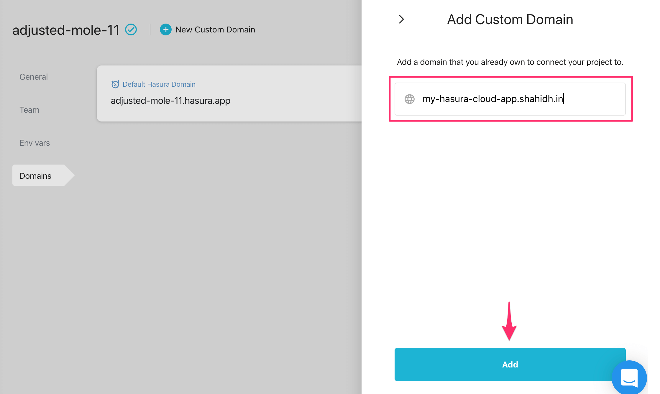 You can add a custom domain to your Hasura Cloud project by following the steps below.