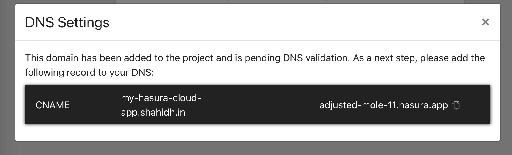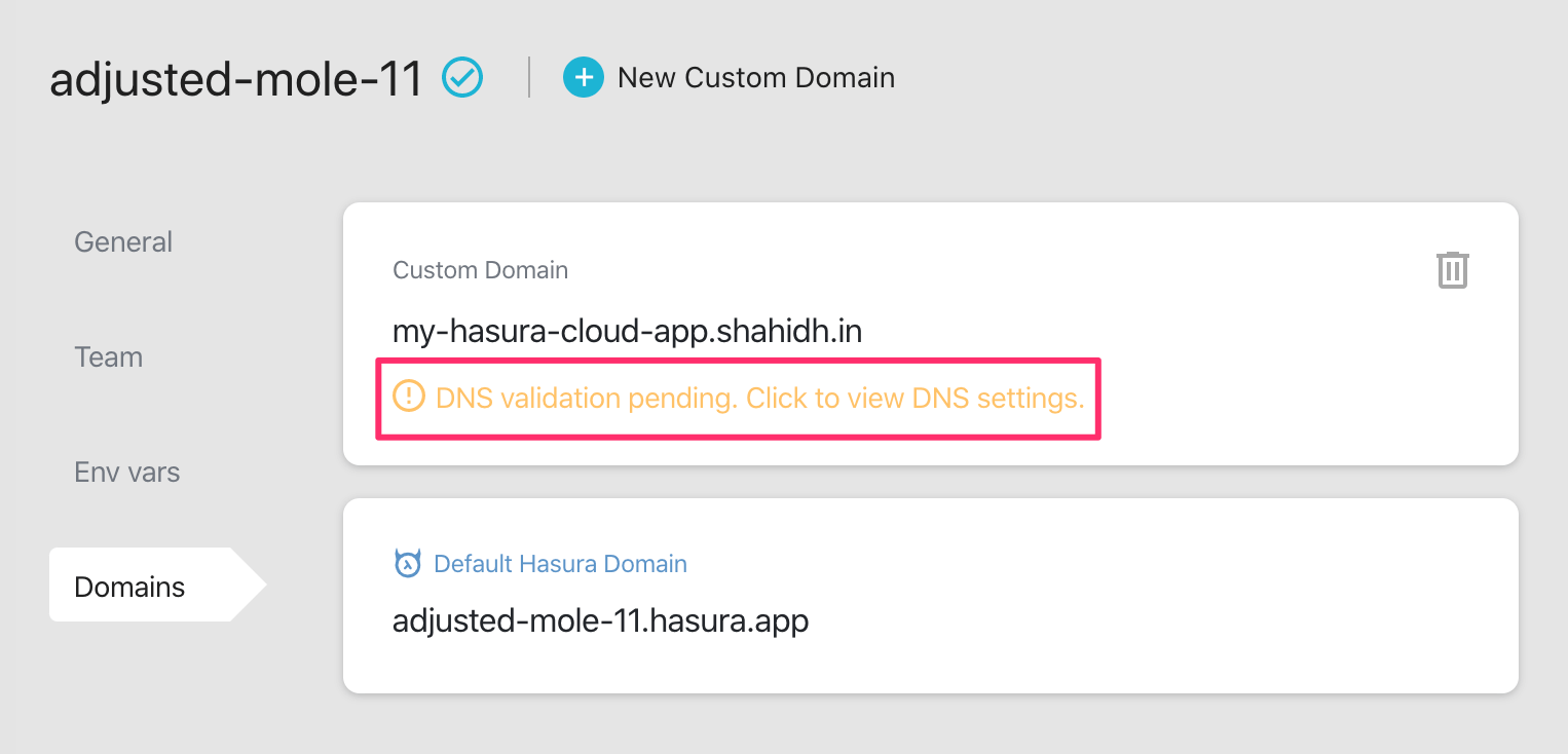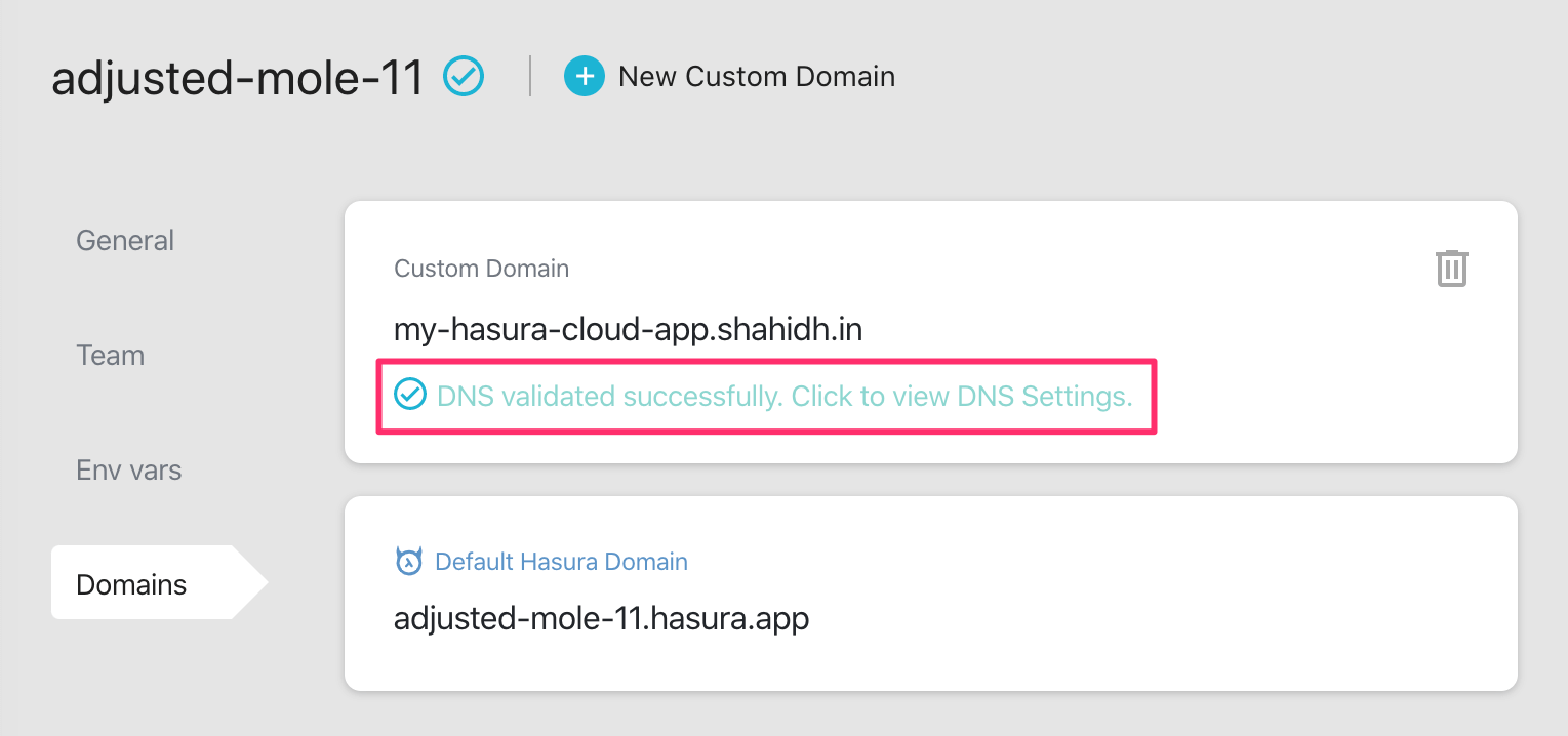 If you haven’t already done so, add the default Hasura domain as a CNAME record to your DNS.