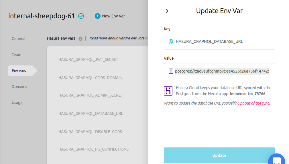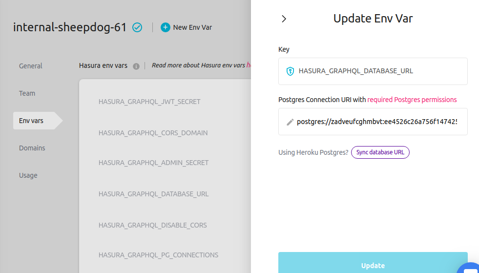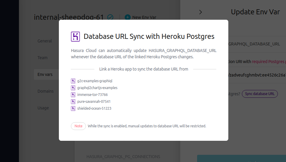 HASURA_GRAPHQL_DATABASE_URLenv var.Click on the