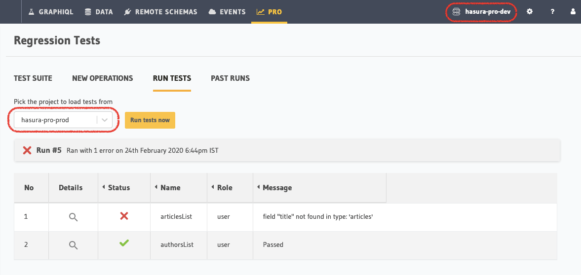 This command will fetch the entire test suite from Hasura Pro and run the tests against given endpoint using the admin secret and report the result on the terminal. The test run and the results will also be available on the Hasura Console.