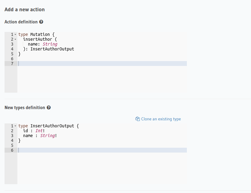 This will open up an editor with metadata/actions.graphql with the following action types auto filled.