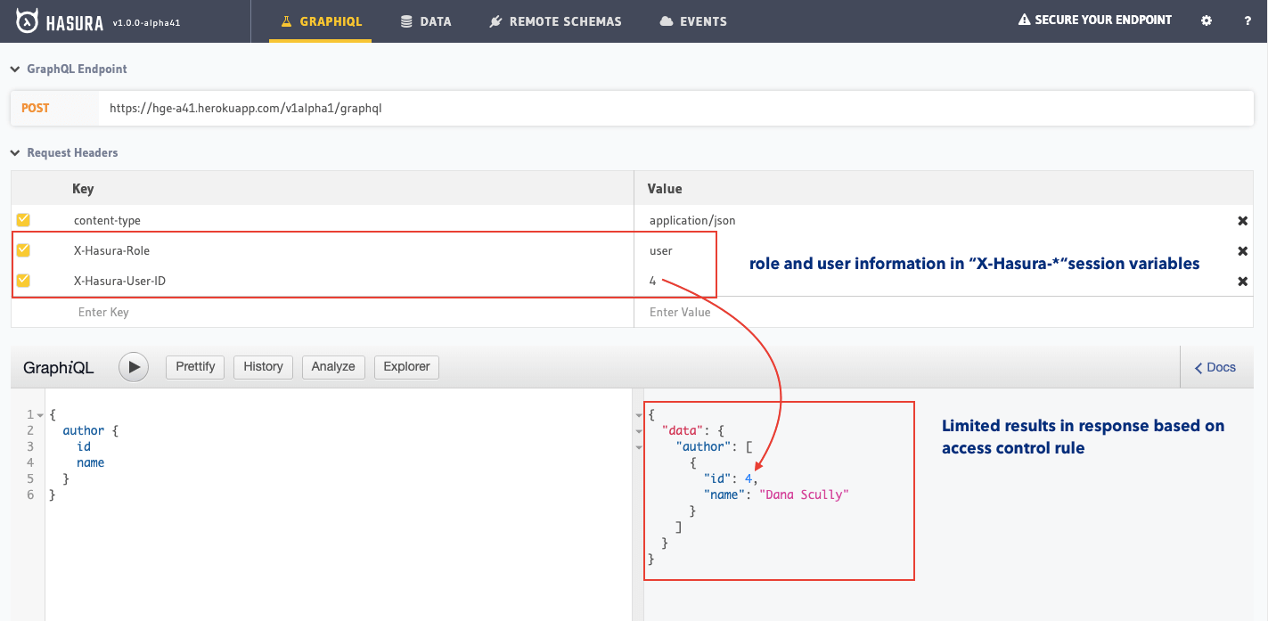 Let’s run the same query as above but now with the X-Hasura-Role and X-Hasura-User-ID session