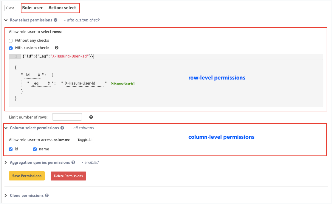 This query returns the right set of results by defining the requirements for columns and rows in a given table. Hasura’s rule-based access control works similary - you define the following permissions for a combination of role, table and action (insert, update, select and delete):