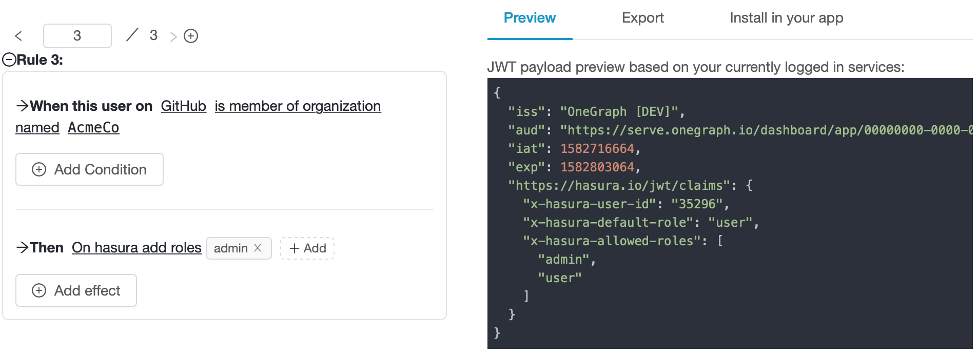 The second concept, rules determines whether the effects are allowed to be added to the JWT. The rules might look like: