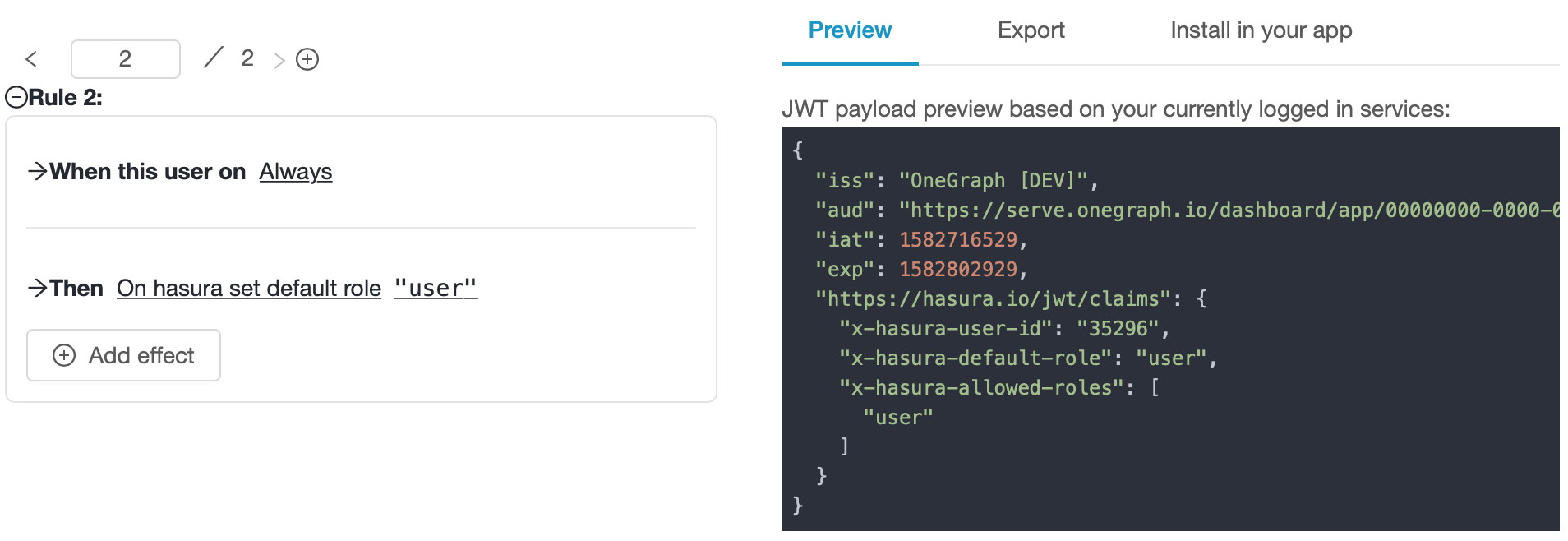 Note that AuthGuardian knows that Hasura requires that the default role also appear in the list of x-hasura-allowed-roles, and added it in both places automatically.
