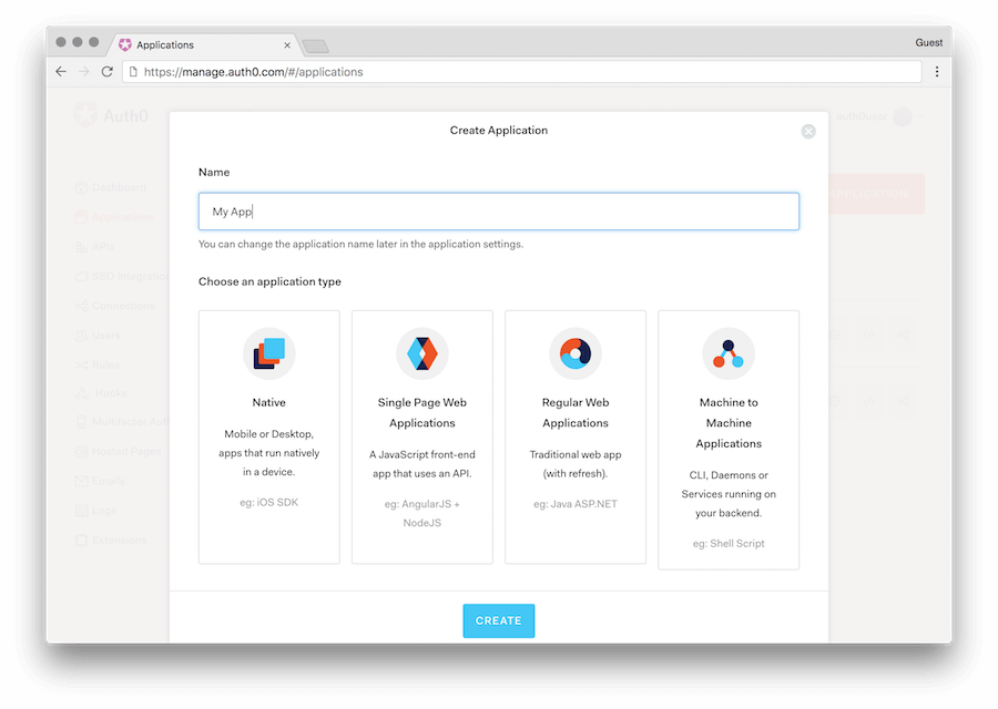 • Click on the Applications menu option on the left and then click the + Create Application button.