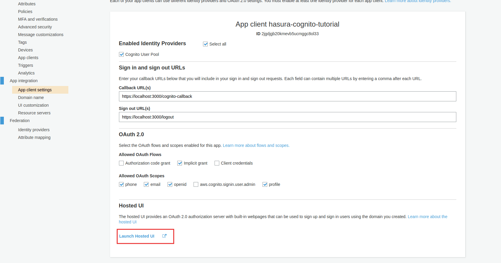 to set up a user pool, add an app and enable the hosted web UI in AWS cognito. While enabling the hosted web UI, you need to select the checkbox Implicit Grant.