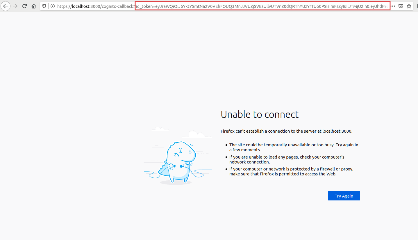 3. After successfully logging in, you will be redirected to https://localhost:3000/cognito-callback#id_token=xxxxxx&yyyyyy.