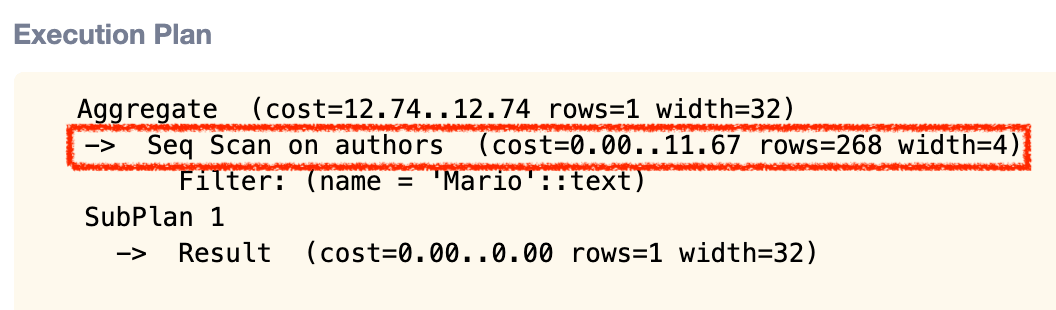 We can see that a sequential scan is conducted on the authors table. This means that Postgres goes through every row of the authors table in order to check if the author’s name equals “Mario”. The cost of a query is an arbitrary number generated by Postgres and is to be interpreted as a measure of comparison rather than an absolute measure of something.