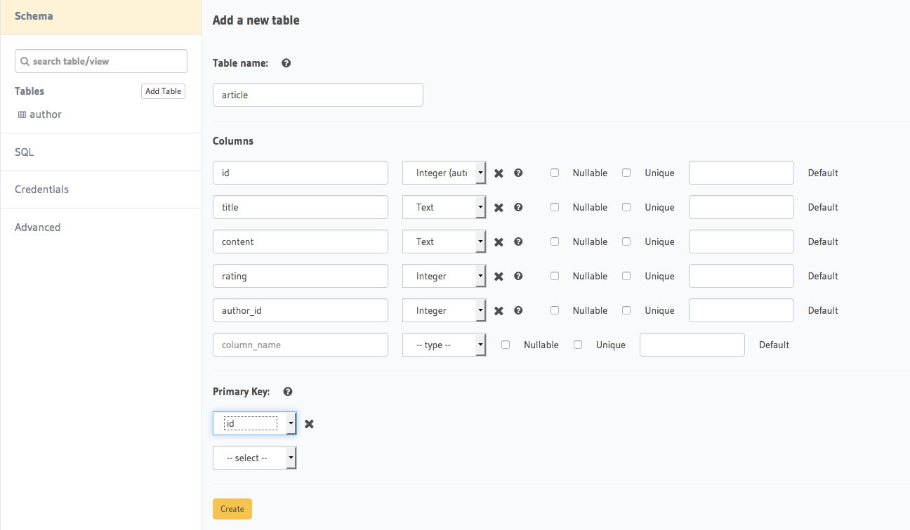"sql": "CREATE TABLE article(id serial NOT NULL, title text NOT NULL, content text NOT NULL, rating integer NOT NULL, author_id serial NOT NULL, PRIMARY KEY (id));"